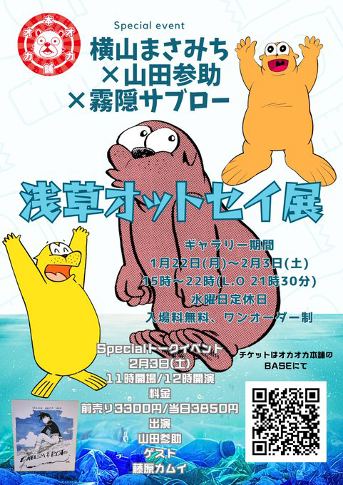 浅草オットセイ展 CAFEオカオカ X Facebook LINE コピー 2024.02.032026.02.22 明日1月22日(月)から【浅草オットセイ展】はじまりま~す✴️横山まさみち先生の激レアな生原画の展示や、山田参助先生、霧隠サブロー先生の貴重な原稿も展示して豪華なオットセイが並びます🎵イベントは2月3日(土)山田参助先生と友情出演で藤原カムイ先生が登場します😆👍️❤️ pic.twitter.com/tnWKwfw9GL— CAFEオカオカ (@cafeokaoka) January 21, 2024