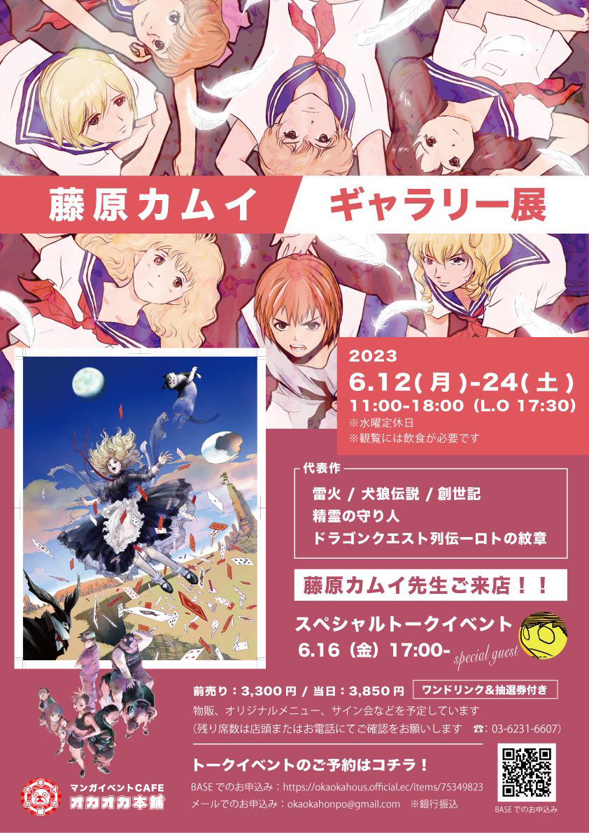 本日6/13(火)も11時よりオープンします。藤原カムイ先生のギャラリー展示中につき、特別メニューやグッズの販売も行っております。 pic.twitter.com/1XVi9s5Pt5