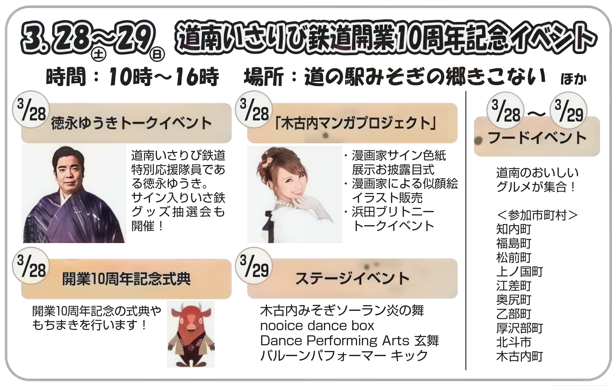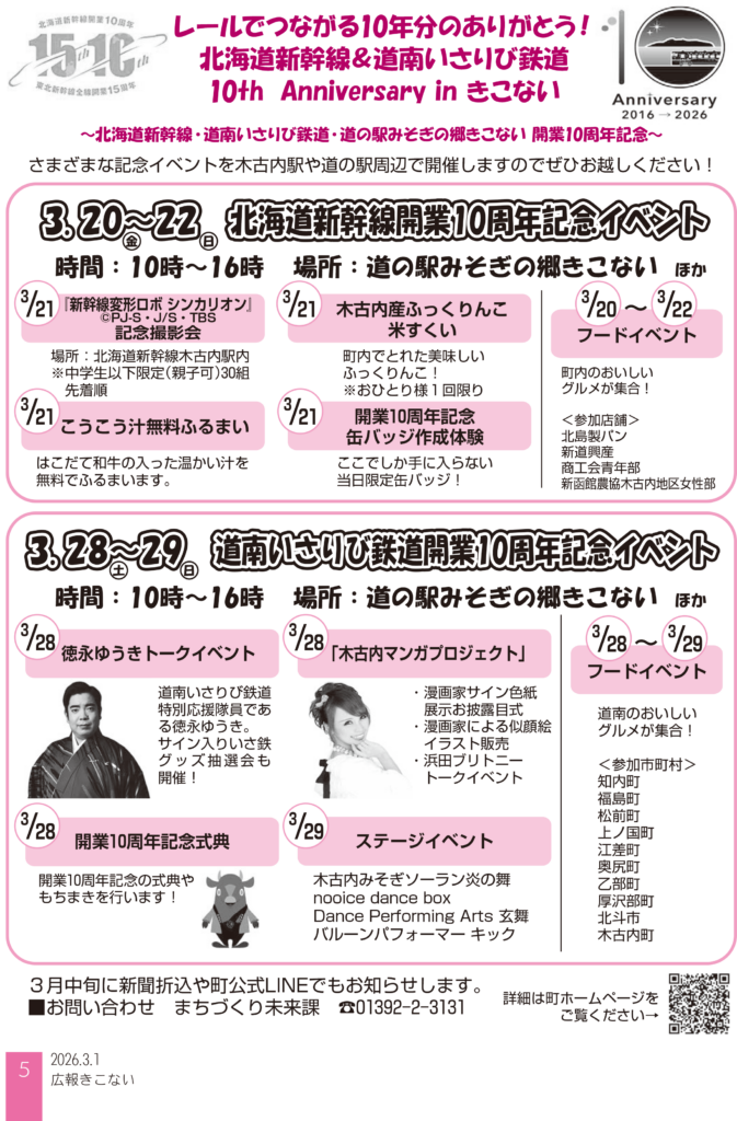 レールでつながる10年分のありがとう!北海道新幹線&道南いさりび鉄道 10th Anniversary in きこない 漫画家 活動情報 X Facebook LINE コピー 2026.03.02 ~北海道新幹線・道南いさりび鉄道・道の駅みそぎの郷きこない 開業10周年~ 北海道新幹線と道南いさりび鉄道は令和8年3月26日に開業10周年を迎えます。木古内町では様々なイベントを開催しますので、皆さんぜひお越しください!
